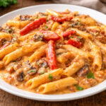 Felöntjük a tejszínnel, majd közepes lángon addig főzzük, amíg kissé besűrűsödik és szószos állagú lesz. Ekkor beleforgatjuk a kifőtt pennét, alaposan összekeverjük, és még 1–2 percig együtt melegítjük.